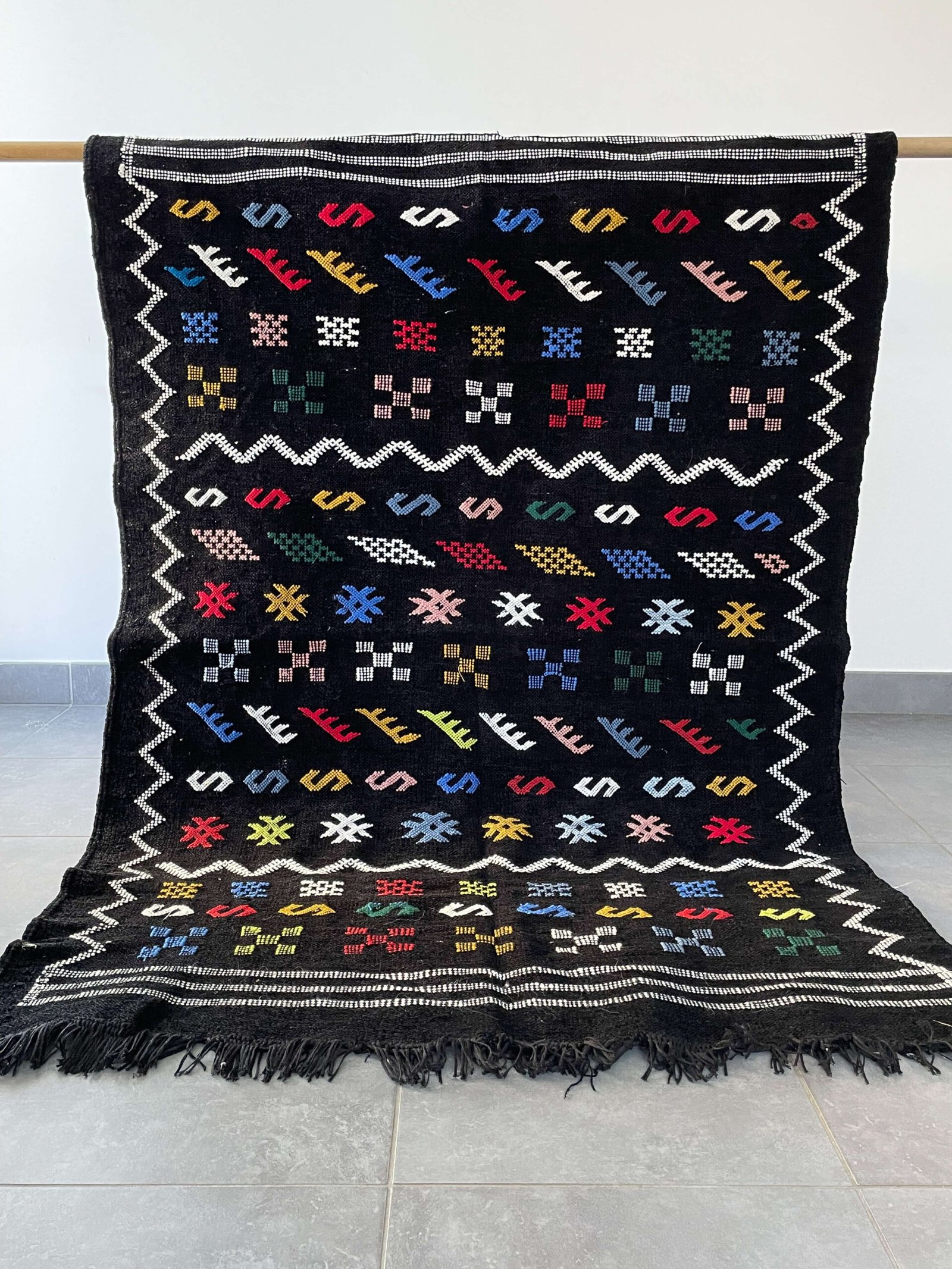 il est parfait pour un intérieur moderne et chaleureux. L’artisanat berbère repose sur des techniques de tissage transmises de génération en génération. Chaque tapis est le fruit d’un travail minutieux, souvent réalisé sans machines, uniquement avec des matériaux naturels. La laine utilisée est généralement issue de moutons élevés localement, et le noir est obtenu à partir de teintures végétales ou de procédés naturels. Ce processus garantit un respect de l’environnement et un produit 100 % éthique.